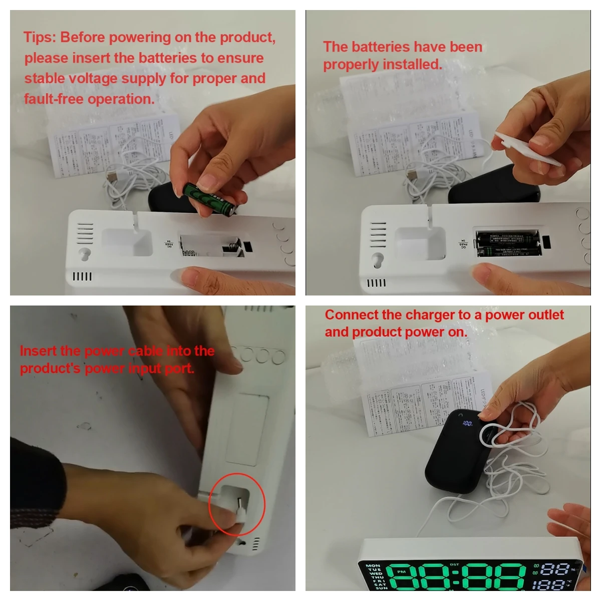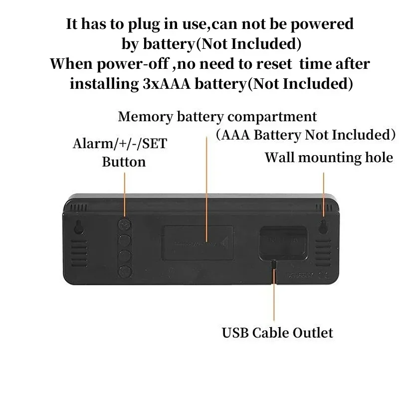 • This clock must be powered via USB. AAA batteries are only for memory backup and cannot power the device.