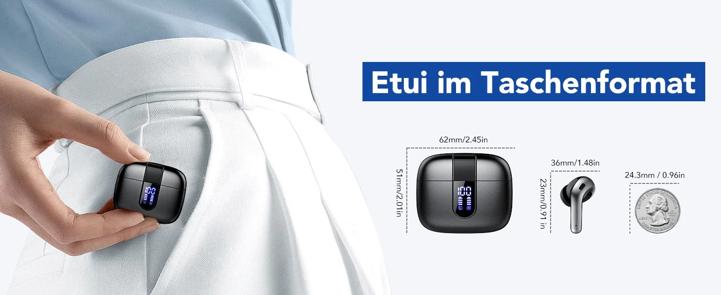 - LED Display: Dual digital LED indicators show battery levels for both earbuds and case