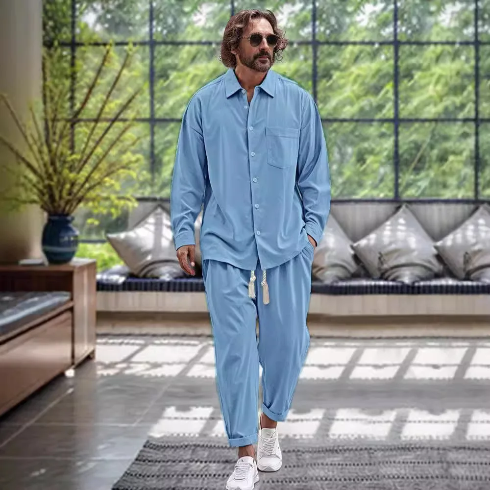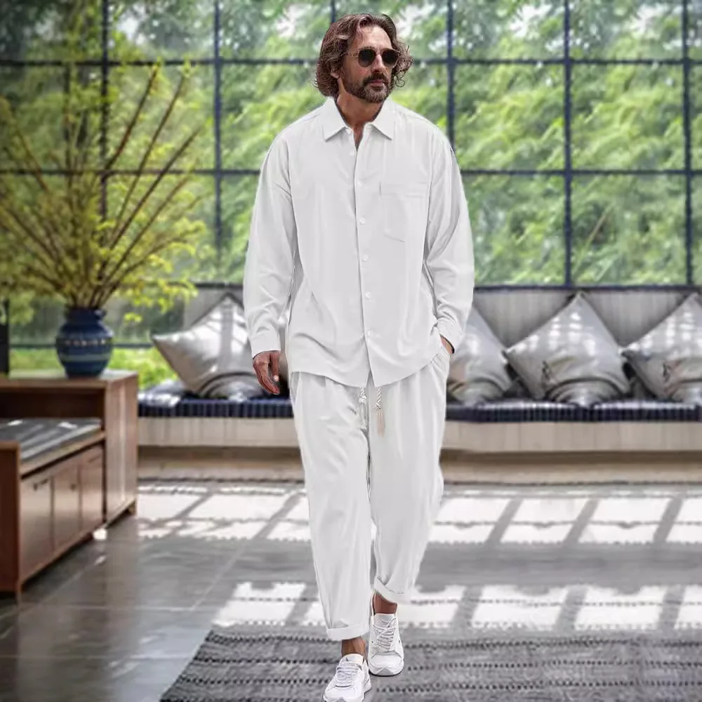 Stay sharp this spring and fall with this stylish two-piece outfit for men. It includes a long sleeve shirt and matching trousers, both made from a soft cotton-linen blend that feels light and breathable.
