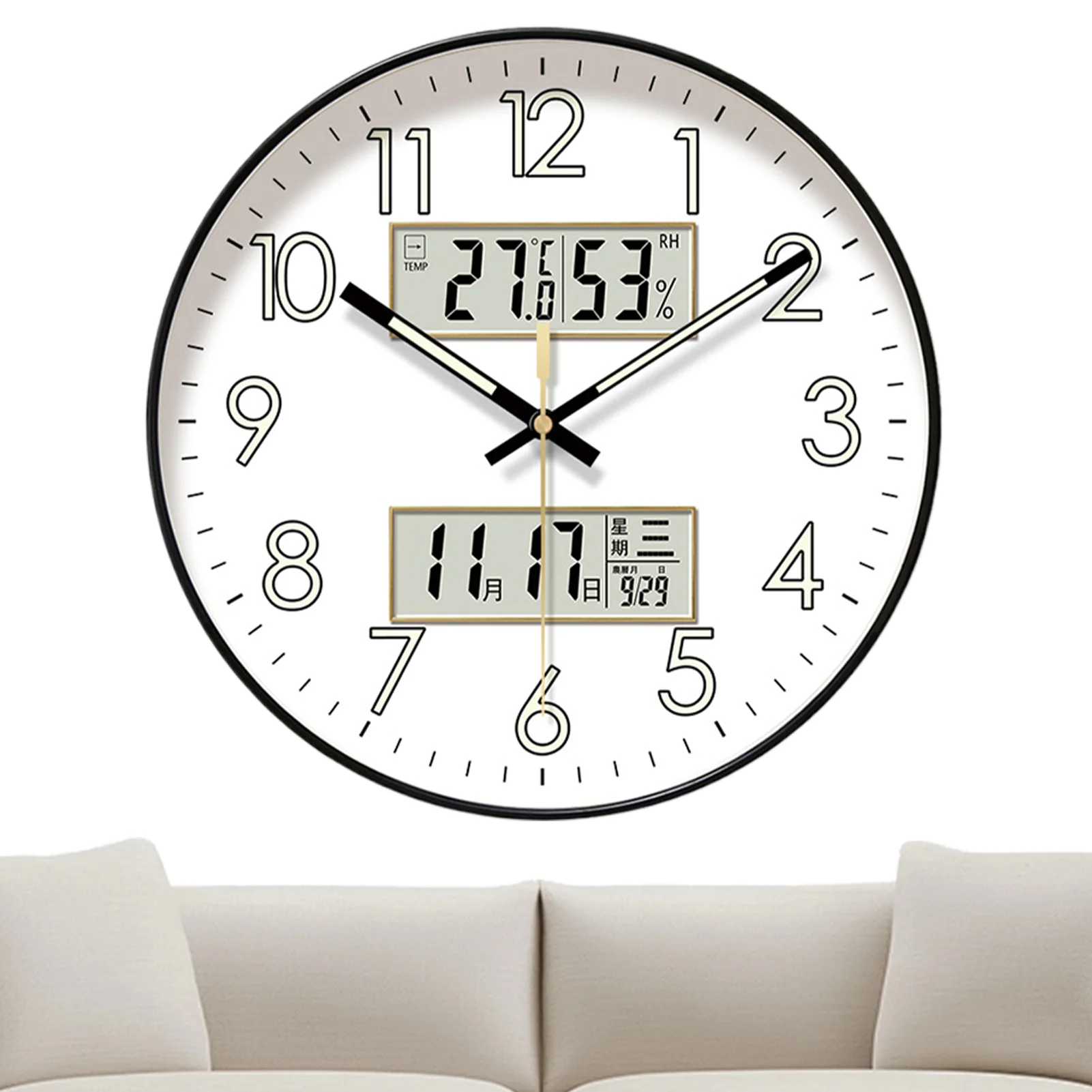Add a touch of modern elegance to your living space with this sleek, circular wall clock. Designed for quiet environments, it features a silent digital mechanism, glow-in-the-dark dial, and multifunctional display. Ideal for adults who appreciate both style and utility—especially in living rooms or bedrooms.