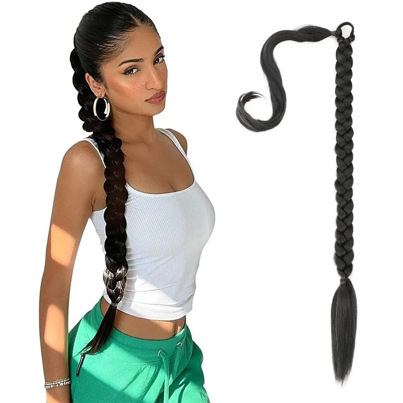 Achieve a sleek, stylish look with these synthetic long straight ponytail wig extensions featuring a trendy boxing braid style. Perfect for women who want instant length and volume, these extensions are available in pure color options of black, blonde, or brown. Made from high‑temperature fiber, they offer a natural appearance and comfortable wear for everyday styling.