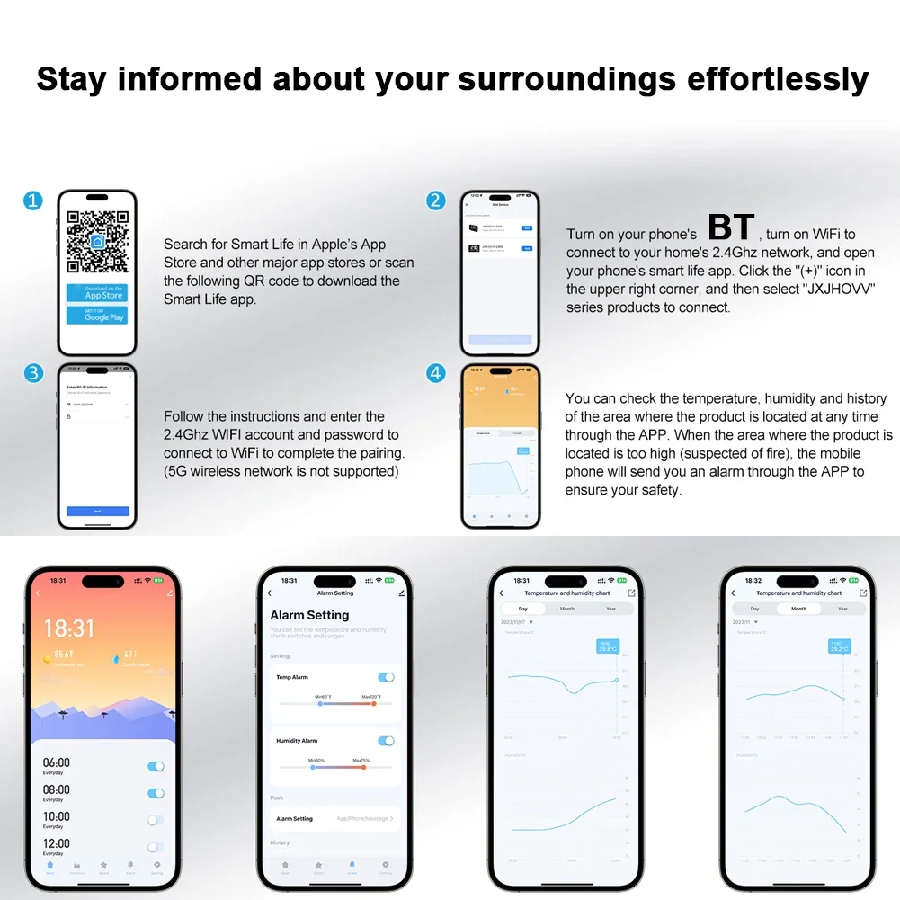 Connect effortlessly through the Tuya app to monitor your space from anywhere. View historical temperature and humidity data through intuitive charts, and receive alerts when temperatures exceed your set threshold. - Vivid LED Display: